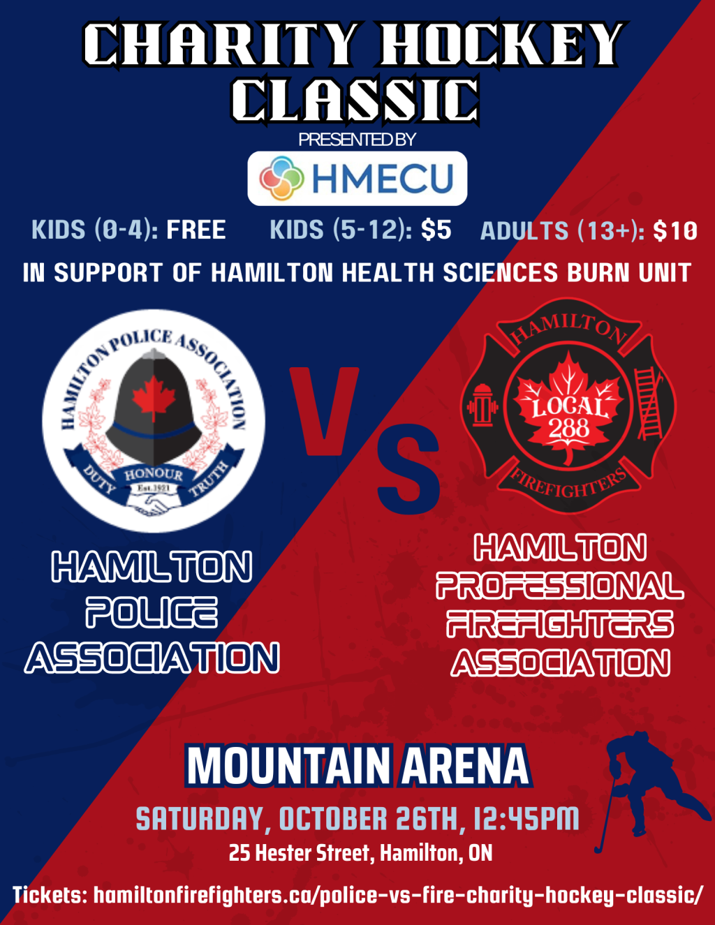 The HPFFA will be hosting a Charity Hockey game on Saturday, October 26th versus the Hamilton Police Association. Game time is at 12:45pm and location is Mountain Arena (25 Hester Street in Hamilton). Proceeds from this fundraiser will benefit the Hamilton Health Sciences Burn Unit at the Hamilton General Hospital.