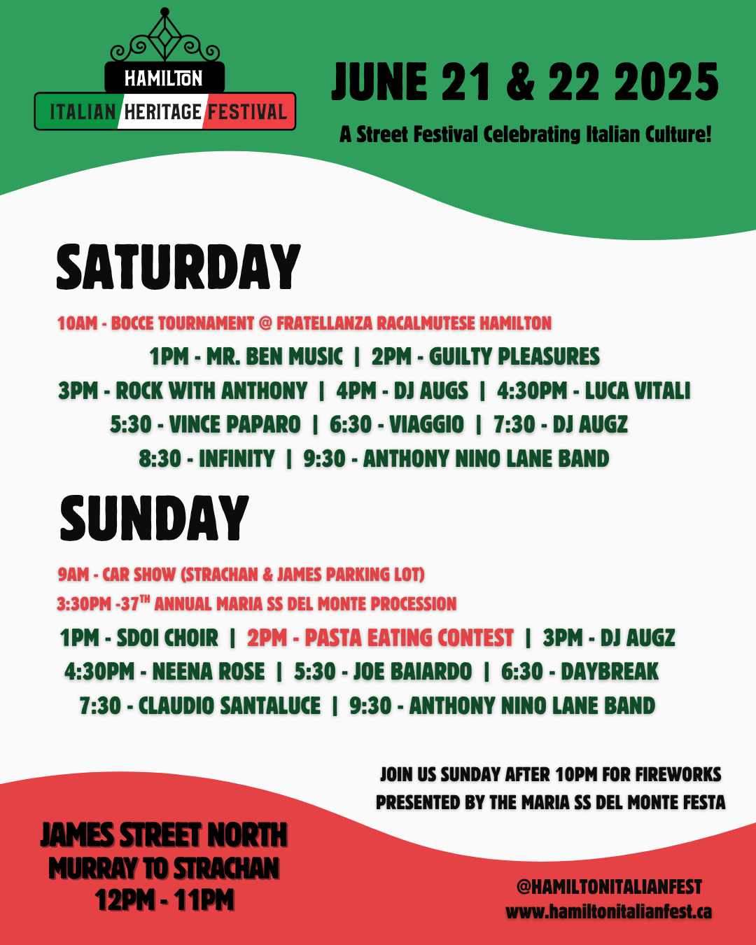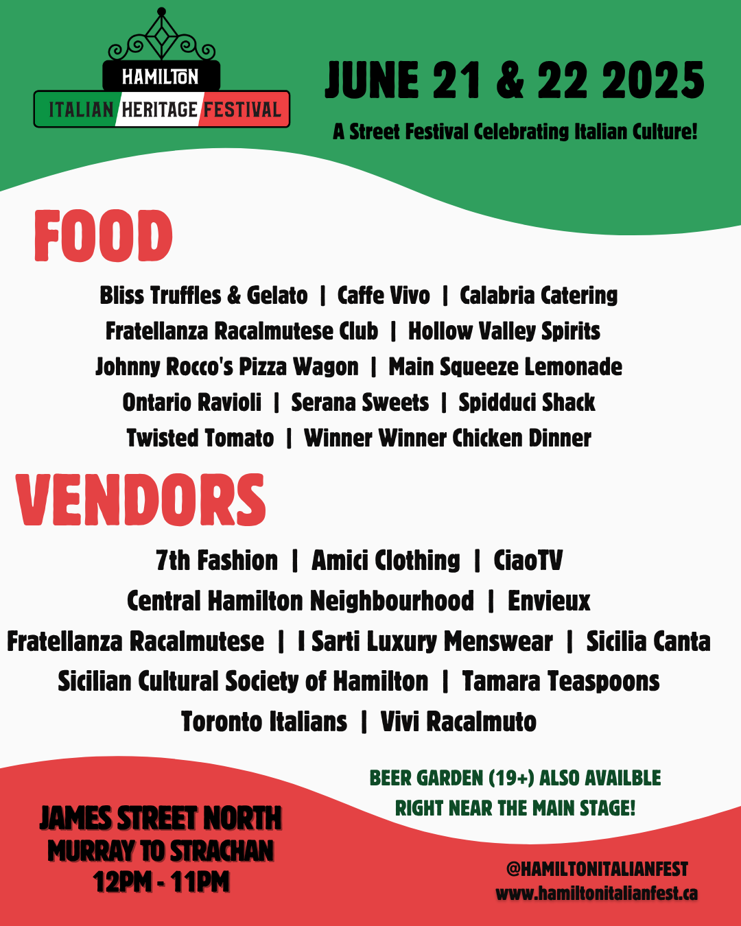 Celebrate Italian culture, cuisine, and community at the Italian Heritage Festival on James Street North from June 21–22!