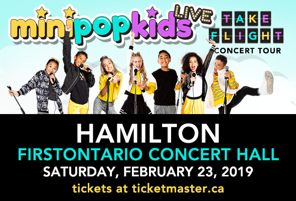 Mini Pop Kids at FirstOntario Concert Hall Where FirstOntario Concert Hall Map When Feb 23/19 03:00 PM - Feb 23/19 06:00 PM Age All Website https://www1.ticketmaster.ca/mini-pop-kids-live-hamilton-ontario-02-23-2019/event/1000553CB1FD4C3D Mini Pop Kids Live! Take Flight Concert Tour Saturday, February 23 at 3:00pm FirstOntario Concert Hall