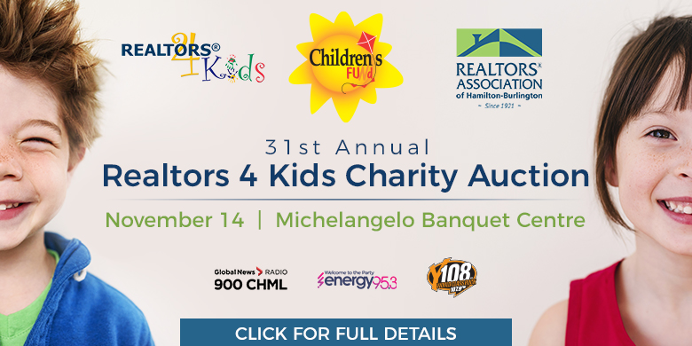 Please join us for the 31st Annual, REALTORS® 4 Kids Charity Auction, on November 14th at Michelangelo Banquet Centre. All proceeds benefit the Children’s Fund. Your ticket includes a 4-course meal, door prizes, raffles, entertainment and a live and silent auction.