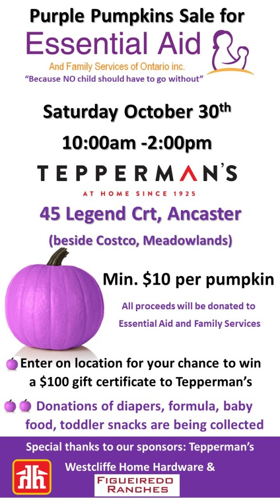 Purple Pumpkins Sale for Essential Aid Where Tepperman's, 45 Legend Crt, Ancaster, On Map When Oct 30/21 10:00 AM - Oct 30/21 02:00 PM Age All