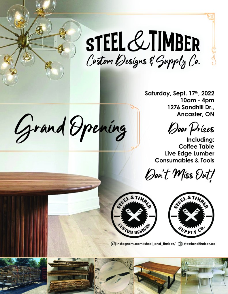 Steel and Timber Custom Designs and Supply Co. Grand Opening Where 1276 Sandhill Drive, Ancaster Map When Sep 17/22 10:00 AM - Sep 17/22 04:00 PM Age All