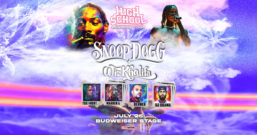 Entertainment icon and rapper Snoop Dogg announces the High School Reunion Tour with Wiz Khalifa, Too $hort, Warren G, and Berner featuring special guest DJ Drama. Produced by Live Nation, the massive 33-city tour kicks off on Friday July 7 at Rogers Arena in Vancouver making stops across the U.S. in Brooklyn, Atlanta, Houston and more before wrapping up in Irvine at FivePoint Amphitheatre on Saturday August 27.