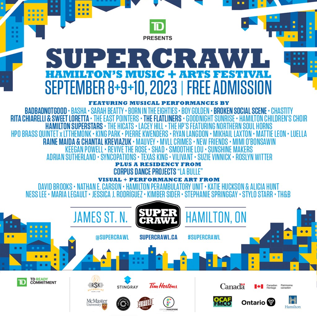 Musical headliners at Supercrawl 2023 (in alphabetical order) will include BADBADNOTGOOD, Broken Social Scene, Rita Chiarelli & Sweet Loretta, The Flatliners, Hamilton Superstars, and Raine Maida & Chantal Kreviazuk. Other musical artists include Basha, Sarah Beatty, Born In The Eighties, Boy Golden, Chastity, The East Pointers, Goodnight Sunrise, Hamilton Children’s Choir, The HiCats, Lacey Hill, The HP’s featuring Northern Soul Horns, HPO Brass Quintet x LTtheMonk, King Park, Pierre Kwenders, Ryan Langdon, Mikhail Laxton, Mattie Leon, Luella, MVLL CRIMES, New Friends, Mimi O’Bonsawin, Keegan Powell, Revive The Rose, Shad, Smoothie Lou, Sunshine Makers, Adrian Sutherland, Texas King, VILIVANT, Suzie Vinnick, and Roslyn Witter. In partnership with Centre and AndThenYou, Supercrawl will also be co-presenting Syncopations, a celebration of Hamilton‐based electronic musicians, DJs, noisemakers, synth heads, and algoravers.