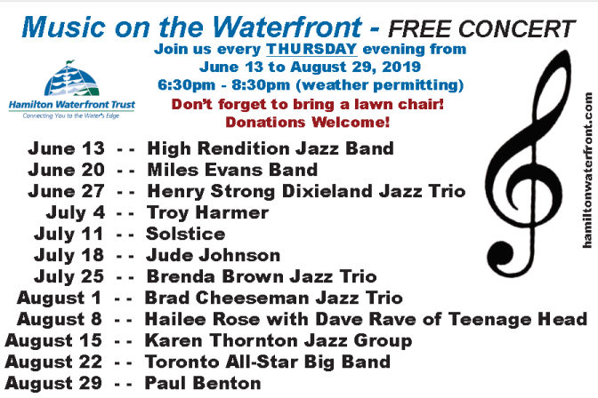 Pier 8, 47 Discovery Dr. , Hamilton Pier 8, 47 Discovery Dr. Hamilton L8L 8K4 Free Jazz & Blues Concerts Join us every Thursday evening from June 13 to August 29 7:00 – 9:00 pm Bring a chair or Blanket While enjoying the free concert, catch the waterfront sunsets, boats in the harbor June 13 High Rendition Jazz Band June 20 Miles […]