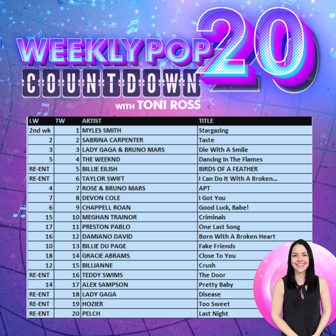 Join Toni Ross as she hosts The Weekly Pop 20 Countdown on Saturdays from 12pm – 2pm and Sundays from 4pm – 6pm!